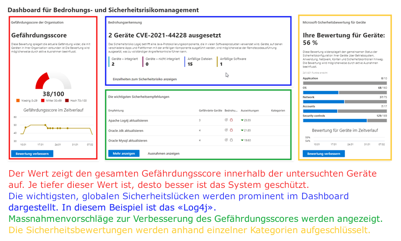 Microsoft ergänzt die MDE Plattform sehr schnell mit Informationen zu den neusten bekannten Sicherheitslücken. Ein zentrales Dashboard ermöglicht es dem Administrator auf einen Blick zu sehen, ob es Systeme gibt, die aktuell bedroht sind. Kommt es zu globalen Sicherheitsvorfällen, wie es bei der kürzlich bekanntgewordenen Lücke «Log4j» der Fall war, schaltet Microsoft separate Reports und Warnhinweise auf.